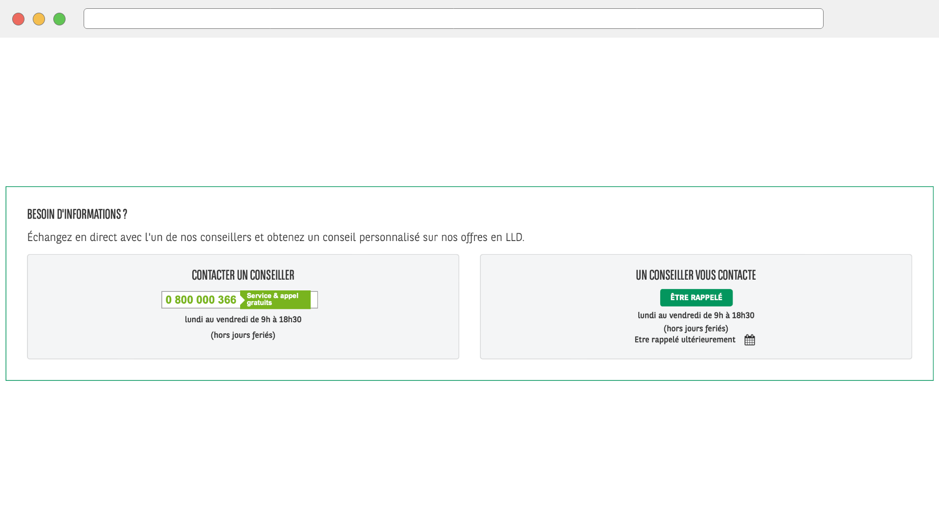 Pour faciliter l'expérience de l'utilisateur, toutes les pages comportent les informations pour contacter un conseiller ou être recontacté